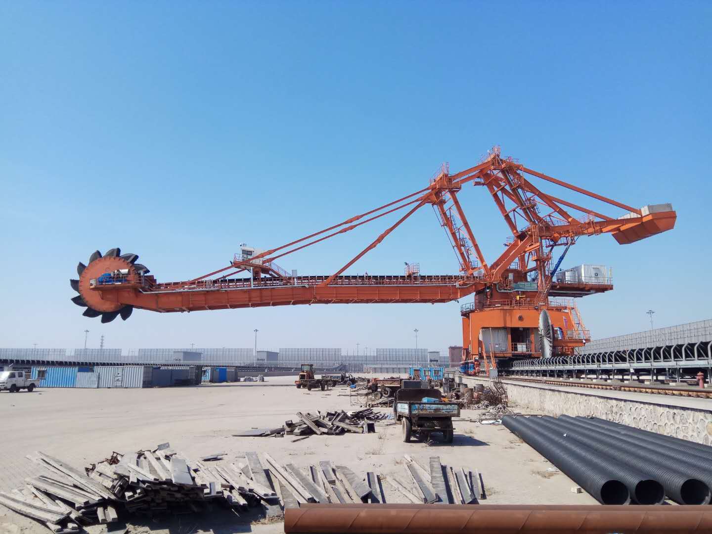 自動化成套斗輪堆取料機(jī)又叫斗輪堆取料機(jī)是工業(yè)大宗散狀物料連續(xù)裝卸的高效設(shè)備,目前已經(jīng)廣泛應(yīng)用于港口、碼頭、冶金、水泥、鋼鐵廠、焦化廠、儲煤廠、發(fā)電廠等散料(礦石、煤、焦碳、砂石)存儲料場的堆取作業(yè)。