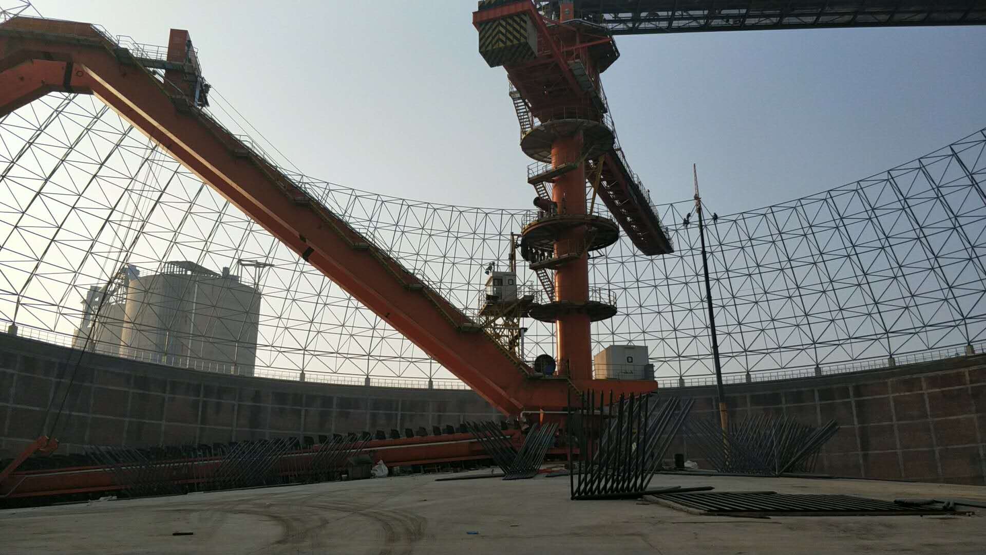 圓堆取料機(jī)是圓形煤場堆取料機(jī)的簡稱,圓形煤場所使用的圓堆取料機(jī)被半球形的煤棚所籠罩,堆取料作業(yè)時集中于定心旋轉(zhuǎn)的回轉(zhuǎn)范圍內(nèi),不受臺風(fēng)等惡劣天氣的影響,同時產(chǎn)生的揚(yáng)塵范圍小,又被拘囿再固定的區(qū)域內(nèi)。